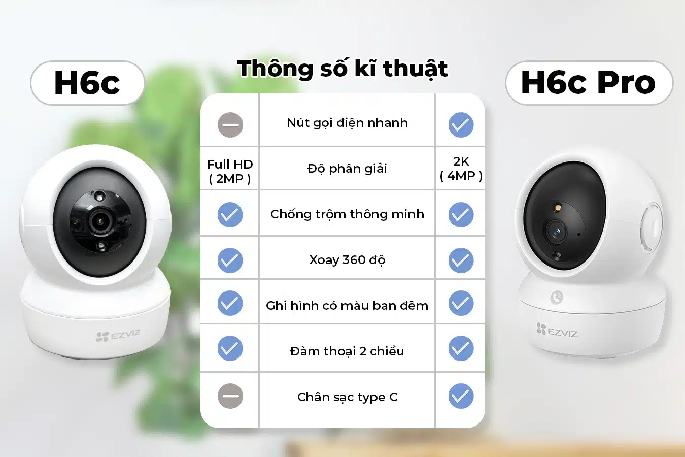 Ezviz H6C ra mắt hai phiên bản: H6C với độ phân giải Full HD (2MP) cùng các tính năng cơ bản thì H6C Pro được nâng cấp với nút gọi điện nhanh, chân sạc Type-C và độ phân giải 2K (4MP) cho hình ảnh sắc nét hơn